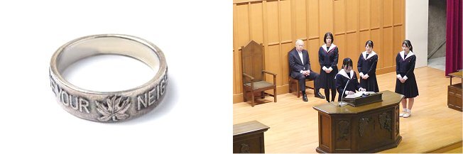 スクールリングは高校生の卒業にあたって贈られる物で、「LOVE YOUR NEIGHBOR」(あなたの隣人を愛せよ)という学院聖句が刻まれており、卒業生の宝物となるものです。