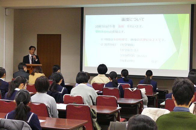 12月6日(土)中学生と保護者を対象に「第1回 高校入試説明会」を開催し、募集要項、特待生制度、インターネット出願の説明、試験と面接について説明を行いました。
