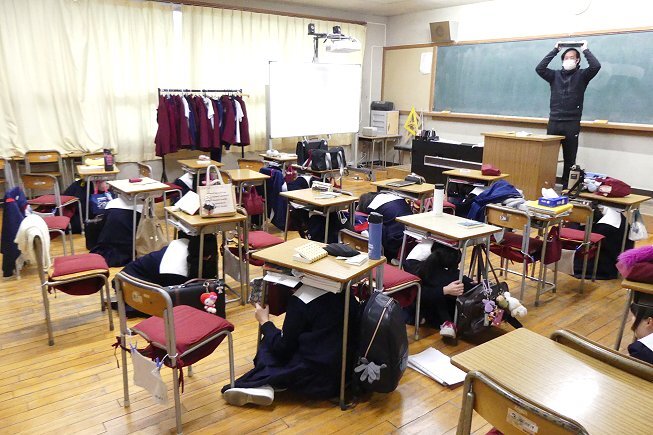 朝の読書時間中に放送があり、抜き打ちでの初動安全確保訓練が行われました。教員の指示のもと、生徒たちは机の下に隠れるなどの避難行動をとりました。30秒間ほどそのままでいましたが、実際の地震では2~3分程揺れが続くと想定されているそうです。