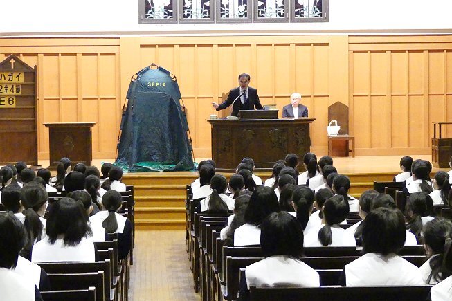 礼拝堂では、校内の防災倉庫に備蓄されている備品が紹介され、簡易トイレの設置方法が実演されました。使う機会がないのが一番ですが、このような物があることを知っておいてください。と、お話がありました。