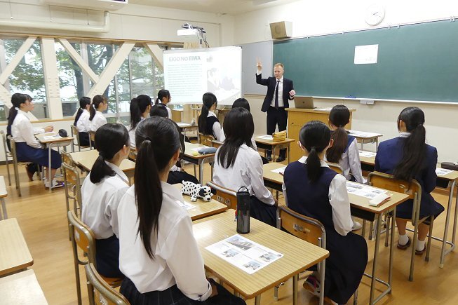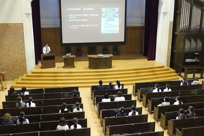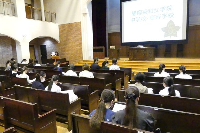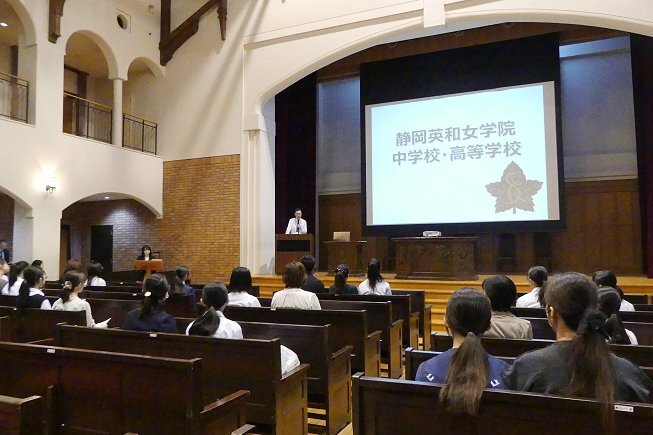 最初に学校説明を行いました。本校はアットホームで穏やかな雰囲気のもと、先輩と後輩の仲が良く、高校から入学した生徒もすぐに馴染める環境です。キリスト教に基づく道徳教育を通じて、外国の文化や考え方を学ぶことができます。また、充実した留学制度や2名の外国人教師による指導により、将来必ず役立つ英語力を身につけられる点など、英和の特徴をご紹介しました。