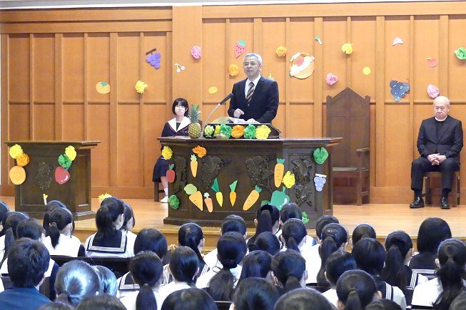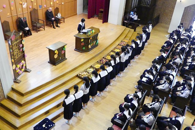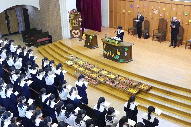 本校では毎年、豊かな収穫の恵みを祝い、その恵みを神に感謝する収穫感謝礼拝を行なっています。朝、生徒たちがリンゴや柿などの果物を持ち寄り、宗教委員の手によって礼拝堂ステージ前に並べられました。
